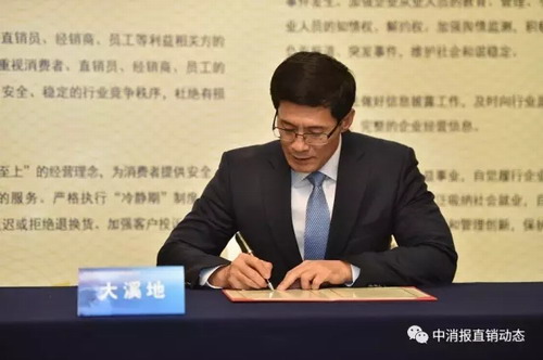 图为大溪地诺丽饮料(中国)有限公司总裁马春林先生在2016中国直销行业规范发展国际交流研讨会期间签署自律承诺宣言。