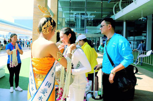 安然家人初到泰国,刚刚走进抵达大厅,身着泰国特色服装的姑娘热情地前来迎接,送上欢迎的花环。