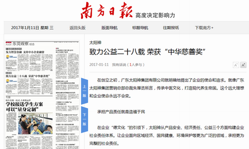 “穷则独善其身,达则兼济天下”。自成立以来,太阳神便始终以“德不孤 必有邻”为企业文化,积极践行社会责任,为社会带来了无限的温暖与正能量。对此,《南方日报》于2017年1月11日以《太阳神致力公益二十八载 荣获“中华慈善奖”》为题,从承担产品责任以及坚持热心公益两大方面,对太阳神公益进行了详细的报道,并给予了高度的赞扬。