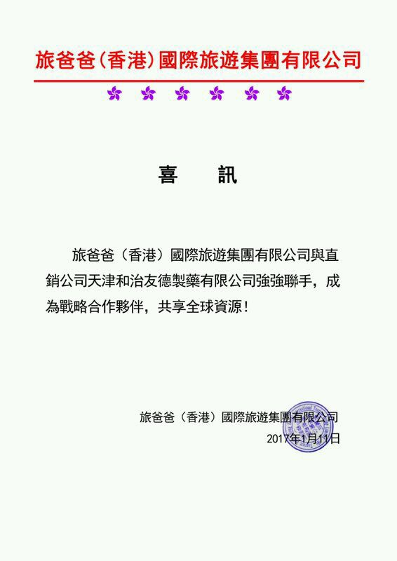 旅爸爸(香港)国际旅游集团有限公司日前与天津和治友德制药有限公司强强联手,正式成为战略合作伙伴,将在双方的业务板块上展开深度合作,共享全球资源。由此,旅爸爸进入了一个全新的发展时代。这是无数旅爸爸家人共同努力的结果,这也让所有旅爸爸家人坚信,2017年将是旅爸爸充满无限希望之年。