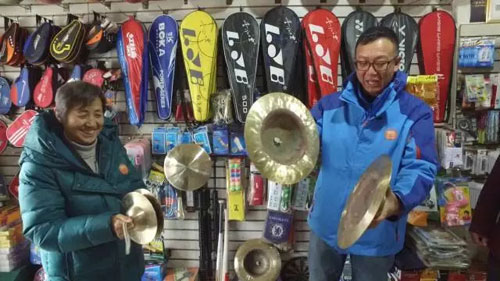 走进店里,我也算长了见识,扇子、腰鼓、罗伞、大镲应有尽有。尤其这大镲,吸引了我的注意力,全铜制作的大镲分量可是不轻,我这身材耍起来都有些费力,尤其是它们撞击的声音,响亮极了,透着陕北人的热情劲儿。