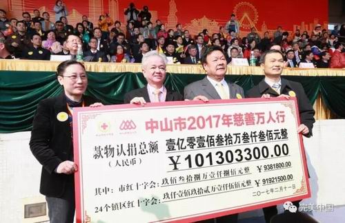 “红十字博爱奖章”获得者吕伟雄、古润金将认捐款物1.01亿多元的善款支票转交给中山市红十字会。