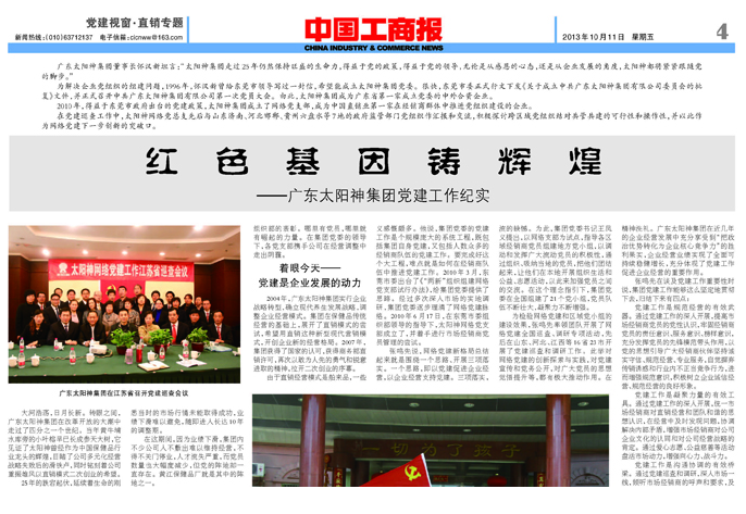 1988年,太阳神集团成立;1993年,临时党支部成立;1996年,太阳神集团党委成立;2010年,太阳神网络党支部成立;2013年,网络党支部升级成为网络党总支;截止2016年底,先后指导成立35个区域市场党小组,基本实现网络党建市场“全覆盖”。