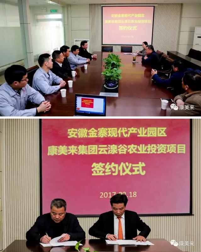 2017年2月18日上午,康美来集团旗下子公司安徽省云湶谷农业科技股份有限公司高山有机食品投资项目签约仪式在金寨现代产业园区举行。康美来集团董事长余春富与中共金寨现代产业园区纪工委书记熊杰分别代表企业和政府在投资协议书上签字。
