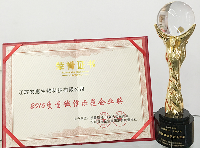 近日,江苏安惠生物科技有限公司荣获 “2016质量诚信示范企业奖”。