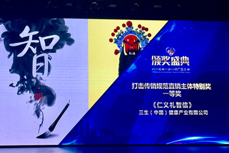 2月23日,四川省第一届公益广告大赛颁奖盛典在成都举行,三生(中国)健康产业有限公司参赛作品“仁义礼智信”从4350件参赛作品中脱颖而出,凭借出彩的设计、巧妙的构思获得打击传销规范直销主体特别奖一等奖。