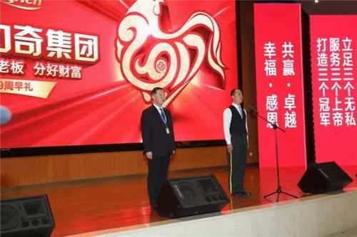 早礼突显出很强的军事化特色:风采展示体现团队意识;人员抽点约束散漫作风;口号呼喊释放压力、凝聚力量;真情互动展现温馨时刻,和谐团队氛围;每周一句正能量,沉淀心灵激励前行;奏唱国歌、同唱司歌,增强民族自豪感、增加企业荣誉感;领导及电话分享,寻找差距、相互学习;徐董发言,发人深省、凝聚力量,为企业发展指明方向;宣誓表决心,再现企业精神,激发必胜信心!