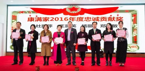 康满家第二届市场咨询顾问委员会核心委员赖俊言先生为康满家“2016年度忠诚贡献奖”的获奖家人颁发荣誉证书和奖品。