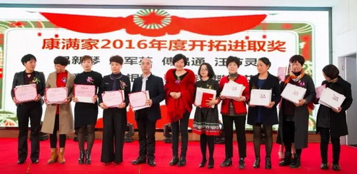 康满家第二届市场咨询顾问委员会核心委员刘秀芳女士为康满家“2016年度开拓进取奖”的获奖家人颁发荣誉证书和奖品。