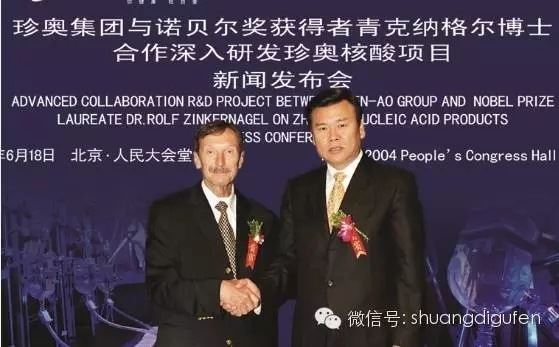 瑞士诺贝尔生理学及医学奖获得者青克纳格尔博士与珍奥双迪事业创办人、荣誉董事长陈玉松在人民大会堂签约