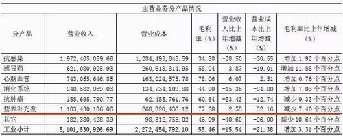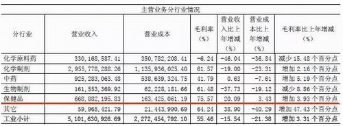 哈药股份按行业划分看,工业部分营收51.02亿元,其中保健品板块营收6.69亿元,同比增长20.09%,毛利率75.57%较上年增加3.93%。按产品划分,营养补充剂营收11.83亿元,同比增长2.58%,毛利率77.28%,较上减少7.40%。