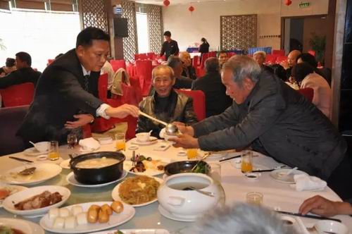 ▲董事长李仲树为老人家盛汤,做慈善他身体力行