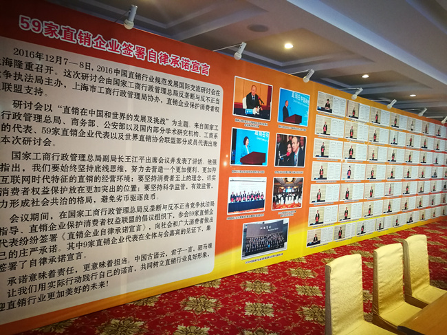 此次座谈会延承了2016年12月在上海召开的中国直销行业规范发展国际交流研讨会的精神,播放了《59家直销企业签署自律承诺宣言》宣传短片,并举办了相关展览。在上海会议上,三八妇乐及58家直销企业共同签署了《自律承诺宣言》。承诺宣言包括了保护消费者权益、守法、诚信、规范经营等十个方面的内容。
