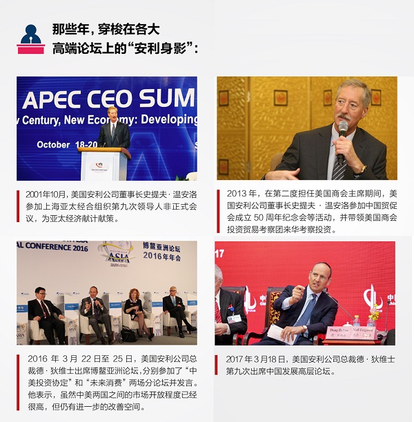 美国安利公司董事长史提夫∙温安洛和德∙狄维士总裁都曾在美国国会发言,力陈中国经济的稳健发展对于美国企业和人民的长远利益,并积极支持中国加入WTO。德∙狄维士总裁更是从 2009 年到 2017 年连续9 届参加中国发展高层论坛,为中国经济发展建言献策。此外,在 2001 年、2013 年两度担任美国商会主席期间,温安洛董事长曾多次带领美国商会投资贸易考察团来华考察投资,参加了亚太经合组织(APEC)上海峰会、中国贸促会成立 50 周年纪念会等活动。