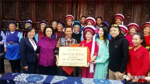 参观结束后,秦国英、萨顶顶、完美云南分公司高级经理崔绍君,共同为扎染带头人段银开的“妈妈制造•周城互助扎染合作社”揭幕挂牌。由完美公司捐助的该合作社集扎染参观、体验、培训于一体,将对扎染这项非物质文化遗产的传承与发展起到积极的推动作用。同时,扎染妈妈们还满怀喜悦地接受了完美公司赠送的20份慰问产品。