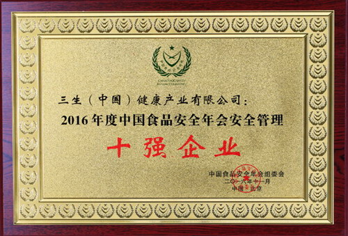 2016年11月18日,在北京人民大会堂举行的第十四届中国食品安全年会上,三生与伊利、加多宝等知名企业一同荣获中国食品安全年会“百家诚信示范单位”称号,黄金宝董事长荣获中国食品安全年会安全管理“十大人物”,同时连续第六年获得大会颁发的“中国食品安全十强企业”称号,成为捍卫中国食品安全的中坚力量。