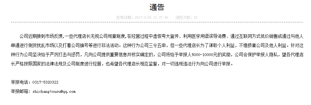 公司近期接到市场反馈,一些代理店长无视公司规章制度,在经营过程中虚假夸大宣传、利用医学用语误导消费、通过互联网方式低价销售或通过与他人串通进行倒货扰乱市场以及打着公司旗号等进行非法活动。这种行为公司三令五申,但一些代理店长为了谋取个人利益,不惜损害公司及他人利益。针对这种行为公司坚决给予严厉打击与惩罚,凡向公司提供重要信息并核实确定的,公司将给予举报人5000-10000元的奖励,公司会保护举报人隐私,望各代理店长严格按照国家的法律法规及公司制度进行经营,也希望各代理店长相互监督,对一切违规违法行为向公司进行举报。