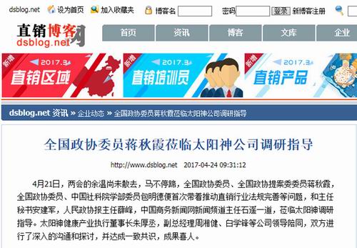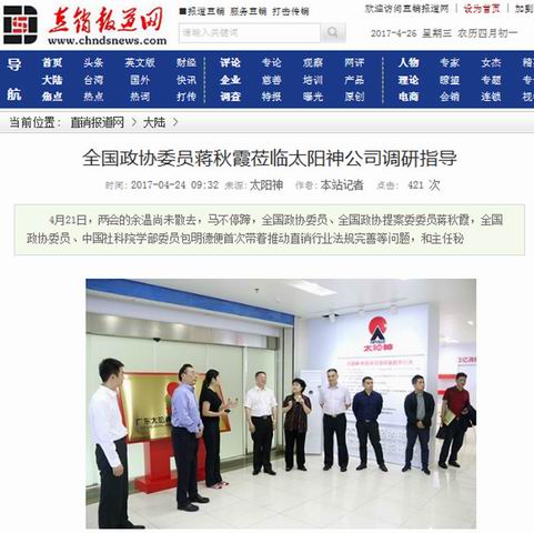 这是两会后蒋秋霞委员一行调研的第一站,意义非凡。因此也受到了中国网、中国经济网、中国日报中文网、光明网、南方网、中国青年网、海外网、凤凰网、新浪网、直销博客网、直销报道网、直销人网等诸多媒体的广泛关注和报道。