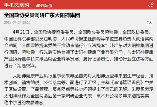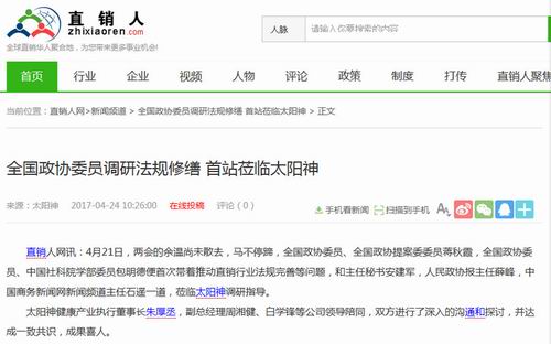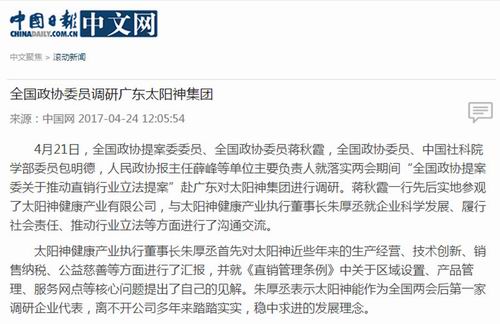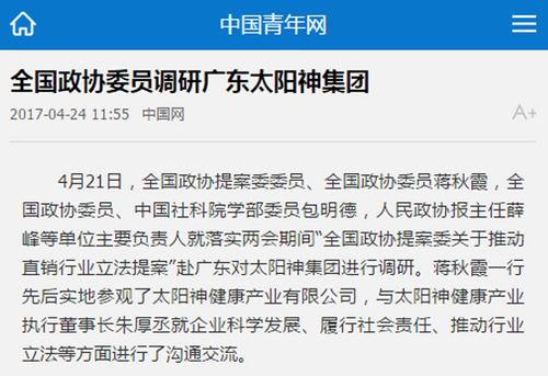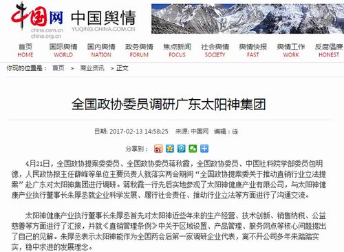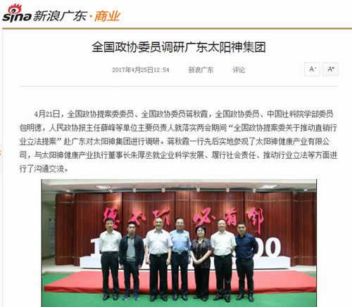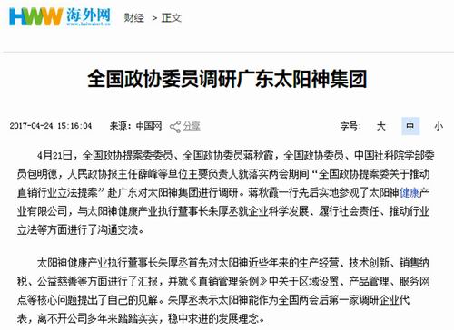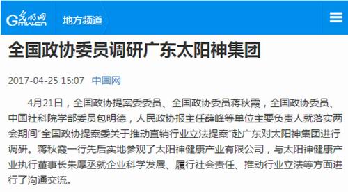 中国网、新浪网等报道全国政协委员调研太阳神