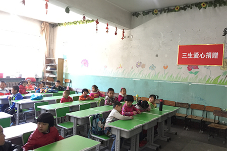孩子们正感受着三生捐赠的爱心教室课桌椅