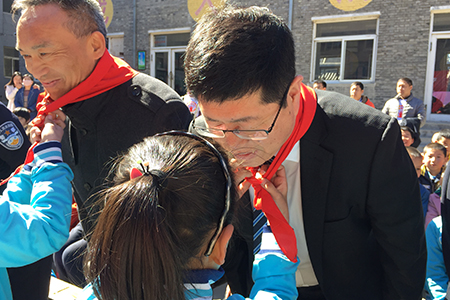 孩子们为三生(中国)董事长助理刘爱峰佩戴红领巾