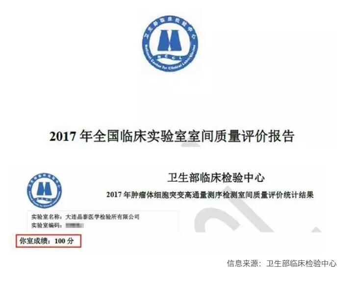 2017年4月,国家卫生部临床检验中心发布了《2017年全国肿瘤体细胞突变高通量测序检测第一次室间质量评价》成绩,双迪基因检测机构晶泰以100%准确性通过了本次室间质量评价。双迪基因检测机构晶泰是辽宁省唯一一家获得满分成绩的医学检验机构。