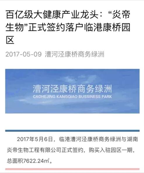 5月6日,临港漕河泾康桥商务绿洲与湖南炎帝生物工程有限公司正式签约,购买入驻园区一期,总面积7622.24平方米。