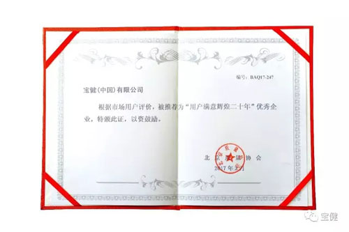优越完善的退换货制度,让宝健21年来多次获得“用户满意企业”荣誉,更在今年获得了由北京市质监局、市经信委、市总工会、市社团办等主管领导颁发的“用户满意辉煌二十年优秀企业”奖。