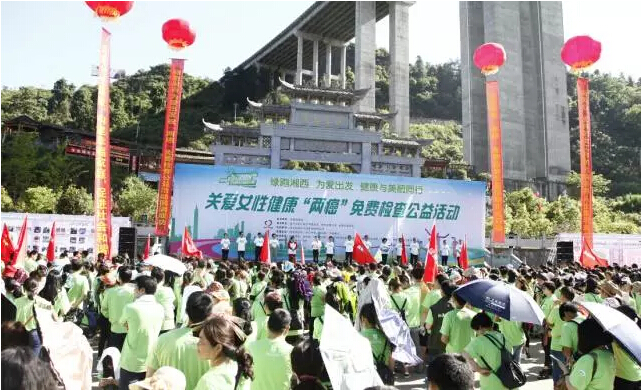 为切实把这项“造福广大农村家庭和关爱女性健康的民心工程”不折不扣地落实好,让适龄妇女群众真正得实惠、普受惠、长受惠。2017年5月13日,由中共湖南省委统战部、湖南省妇女联合会、湖南省卫生和计划生育委员会、湖南省海外联谊会、中共湘西自治州委统战部、湘西自治州妇女联合会、湘西自治州卫生和计划生育委员会、湘西自治州海外联谊会以及绿之韵集团联合开展的“关爱女性健康‘两癌’免费检查暨绿跑公益活动”在湘西自治州吉首市举行。