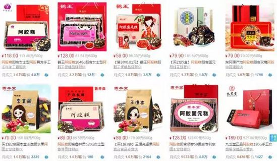天猫平台的阿胶糕销售状况可以反映出一定的市场状况:目前在天猫销售靠前的品牌包括千年生工(鲁润阿胶旗下)、鹤王、颜桃花、中膏、固本堂、九芝堂、桃花姬等等,品牌比较分散杂乱,价格更是两级分化。