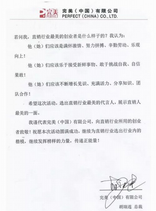 完美(中国)有限公司总裁胡瑞连先生,应主办单位邀请,出任首届(2017)寻找直销行业最美创业者活动评审委员会委员。