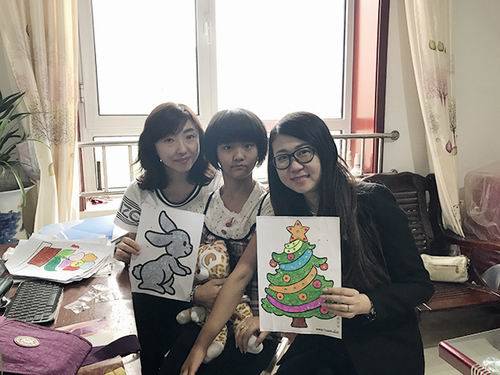 随后,大家来到了孙宝怡小朋友的家中,一位漂亮、爱笑的小天使,由于生产时间较长,大脑缺氧造成肌张力高,因长期处于肌肉紧缩、僵硬的状态,她的指关节已经变形了,老师每周会为她做肌肉放松、关节按摩来缓解她的症状。因为她特别喜欢画画,老师会经常辅导她。康婷公司高管看望宝怡时,她把自己的作品展示给大家看,老师说这些本来是希望她能够一学期完成,没想到她一周就完成了,宝怡还将她最喜欢的圣诞树和小兔子两幅画送给了康婷公司的叔叔阿姨们。