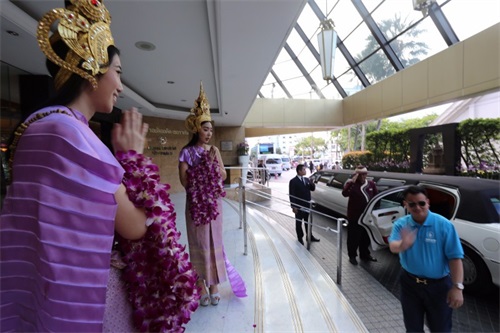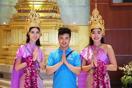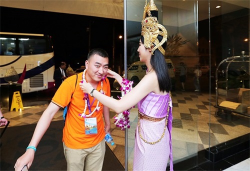 身着传统服饰,手捧鲜花,满面笑容的当地美女,已在家人们下榻的酒店恭候多时,见到家人,她们双手合十“萨瓦迪卡”,送上甜甜糯糯的泰国问候,并为抵达酒店的家人们献上花环。