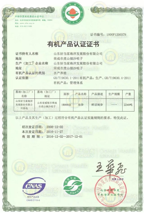 连续8年有机刺参产品认证