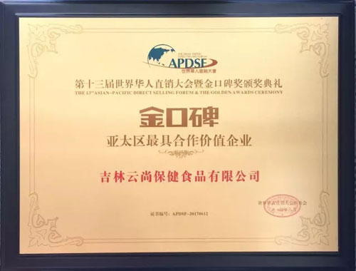 “金口碑亚太区最具合作价值企业”奖——吉林云尚凭借多年的业界经验、强大的企业实力及良好的业界口碑获此殊荣,证明了云尚的巨大发展潜力。