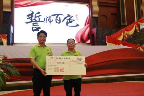 紧接着,董事长黄佳林代表炎帝生物向百色市捐助90万元爱心基金,百色市教育局局长苏元东代表百色市教育局接受爱心基金。