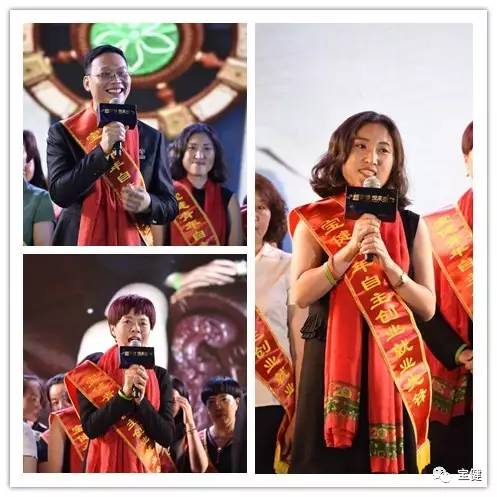 来自江西南昌的孙洋(右),江苏徐州的张郅晨(左下)、浙江台州的林明瑞(左上),三位宝健年轻代表上台分享了自己在宝健成功创业的经验,为新伙伴加油打气。