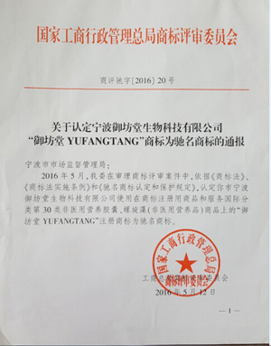 近日,国家工商行政管理总局发布商评驰字〔2016〕20号文件:依据《商标法》、《商标法实施条例》、《驰名商标认定和保护规定》的规定,经商标评审委员会评审,宁波御坊堂生物科技有限公司使用在商标注册用商品和服务国际分类第30类非医用营养胶囊、螺旋藻(非医用营养品)商品上的“御坊堂YUFANGTANG”注册商标被认定为“中国驰名商标”。