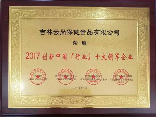 于2017年6月喜获由经济日报中国经济信息杂志社、国家发展改革委宏观经济管理编辑部等机构联合发起举办的“2017中国创新与经济融合发展大会暨创新成果推介活动”中,吉林云尚保健食品有限公司经过层层选拔,喜获“2017创新中国(行业)十大领军企业”称号。