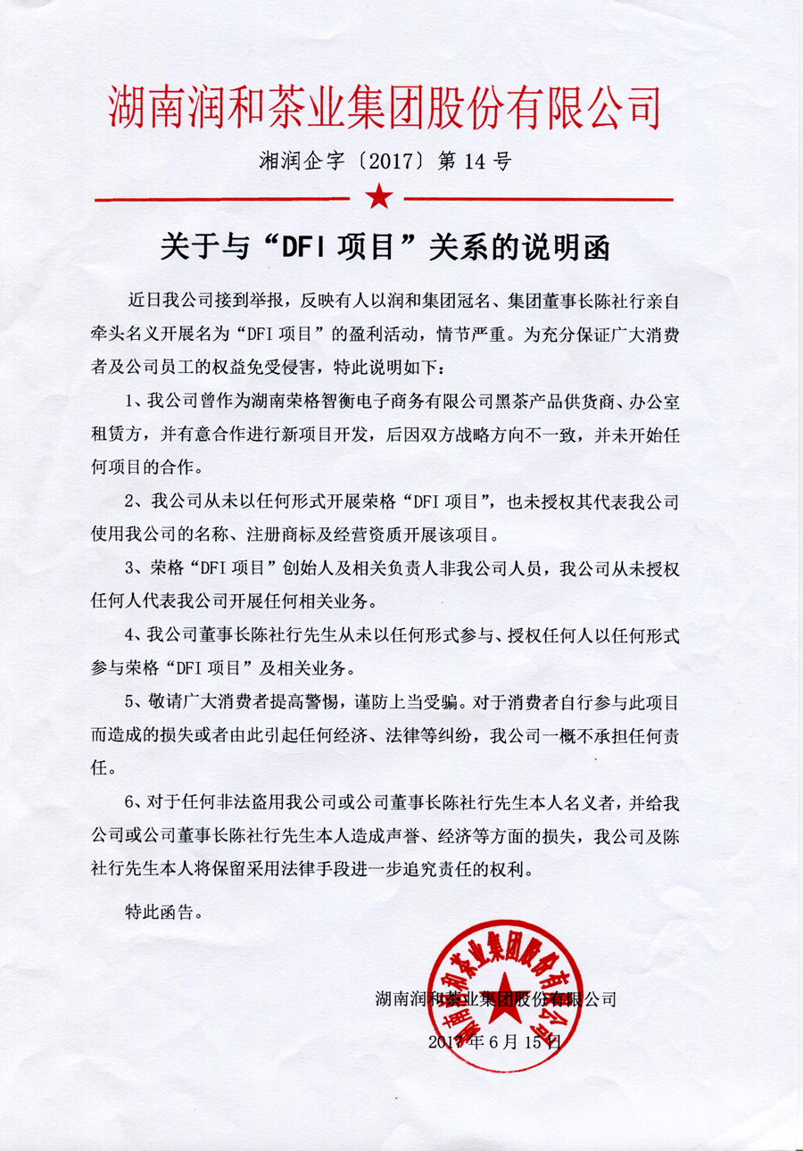 2017年6月16日,湖南润和集团在官网上发布了关于与“DFI项目”关系的说明函,表示公司从未以任何形式开展荣格“DFI项目”,荣格“DFI项目”创始人及相关负责人也并非润和公司人员。