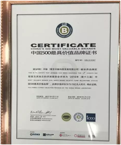 (南京中脉科技发展有限公司荣获“中国500最具价值品牌证书”)