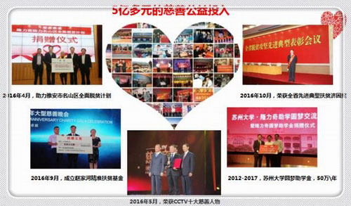 公司发展31年来,在文化、慈善事业上累计支持高达 5亿多元! 2013年,公司的公益捐赠累计达4241万元;2014年,累计达4150万元;2015年,累计达3050万元,2016年累计达3000万元。