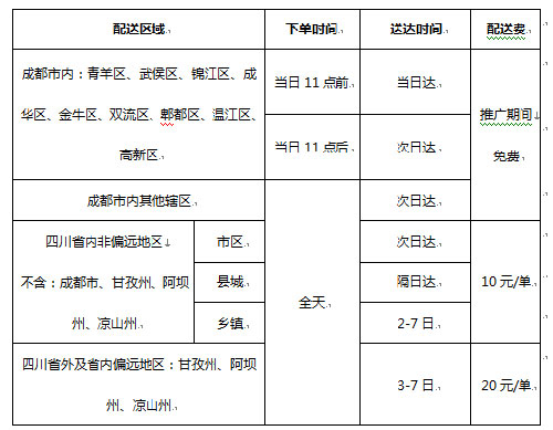 注意:目前成都市内及市内其他辖区,在推广期内是免费配送的。