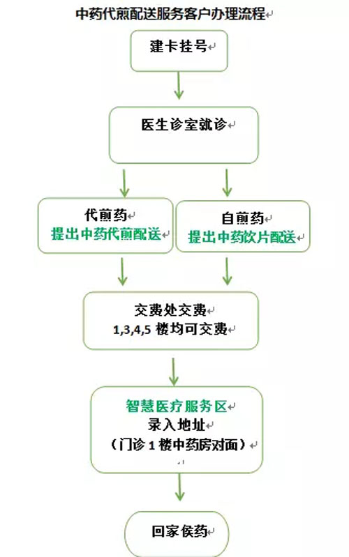 其实很简单,你只需要在就诊时向医生提出需要智慧药房“中药代煎配送”或“中药饮片配送”服务,然后跟往常一样去缴费处交费,交完费不需要去门诊中药房排队取药,只需要拿着处方单和发票到“智慧医疗服务区”录入地址信息,然后就可以轻松回家侯药了。