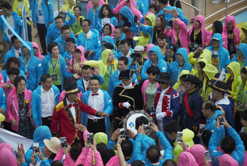 下午17点30分,启航派对在船头泳池畔拉开帷幕,炎帝高管及团队领袖代表身着富有加勒比风格的华丽服装在甲板上与大家亲切互动,在风雨雷电的助威中率领伙伴们壮志启航,数千名炎帝家人见证了这一激动人心的时刻。