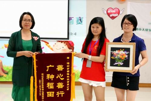 ▲天使家园工作人员为孙小玲总经理颁发感恩锦旗及纪念手工刺绣画作,感谢荣格公司对脑伤宝宝的关爱。