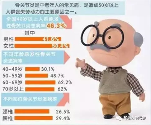 骨关节病患者主要为45岁以上人群、女性人群及体重超重人群。相关统计数据表明,我国40岁以上人群原发性骨关节病患病率为46.3%,60岁人群比40岁人群的患病率高出一倍多。