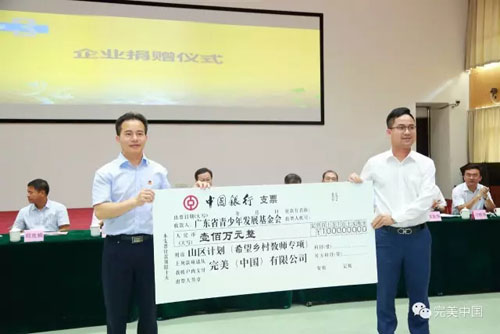 完美公司董事长助理、省青联常委徐奕新(右)代表完美移交捐赠支票