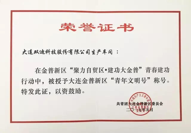 作为中国第10个国家级新区和辽宁自贸区核心区,大连金普新区组织开展了“聚力自贸区•建功大金普”青春建功行动,双迪股份洗护车间被授予大连金普新区“青年文明号”殊荣。