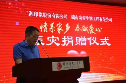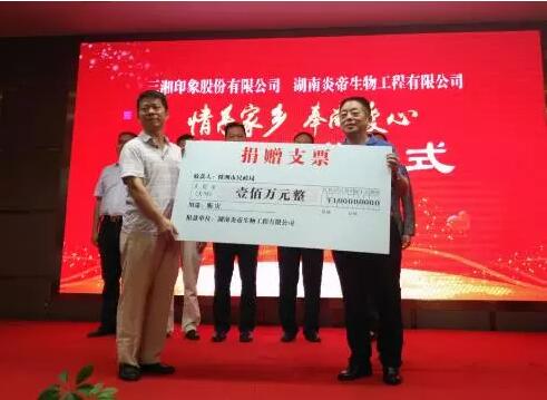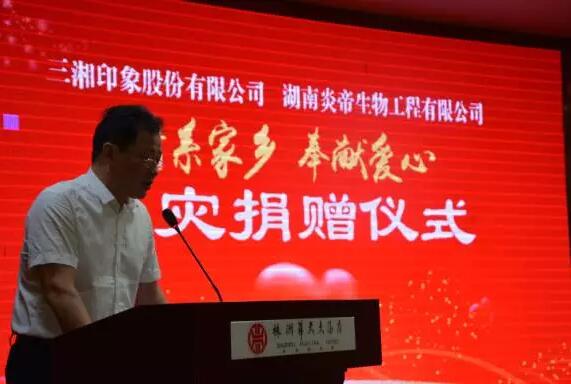 2017年7月29日上午,由株洲市政府部门发起的“情系家乡,奉献爱心”赈灾捐赠仪式在株洲市华天大酒店隆重举行,炎帝生物兄弟公司三湘印象和炎帝生物分别捐赠善款100万元,以实际行动支援家乡灾后建设工作,为受灾群众带去一份真情与关爱。副市长顾峰,市副秘书长郑剑,市民政局副局长卢仲良等领导出席,炎帝生物董事长黄佳林,三湘集团副总裁厉农帆,炎帝生物行政中心总经理万义,电商中心副总经理田凯天代表公司出席了本次活动。